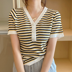 2022新款短款方领条纹短袖t恤女夏季韩版小个子显瘦冰丝针织上衣